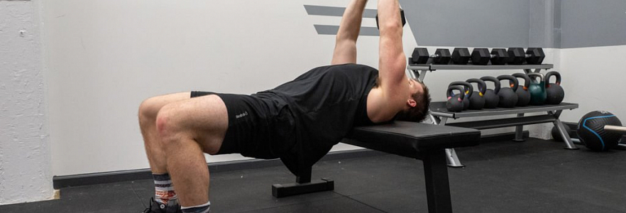 1   ЛЯГТЕ на скамью, как будто собираетесь выполнить жим гантелей лежа, но обопритесь только головой и верхней частью спины. Держите таз в воздухе и напрягите мышцы корпуса.